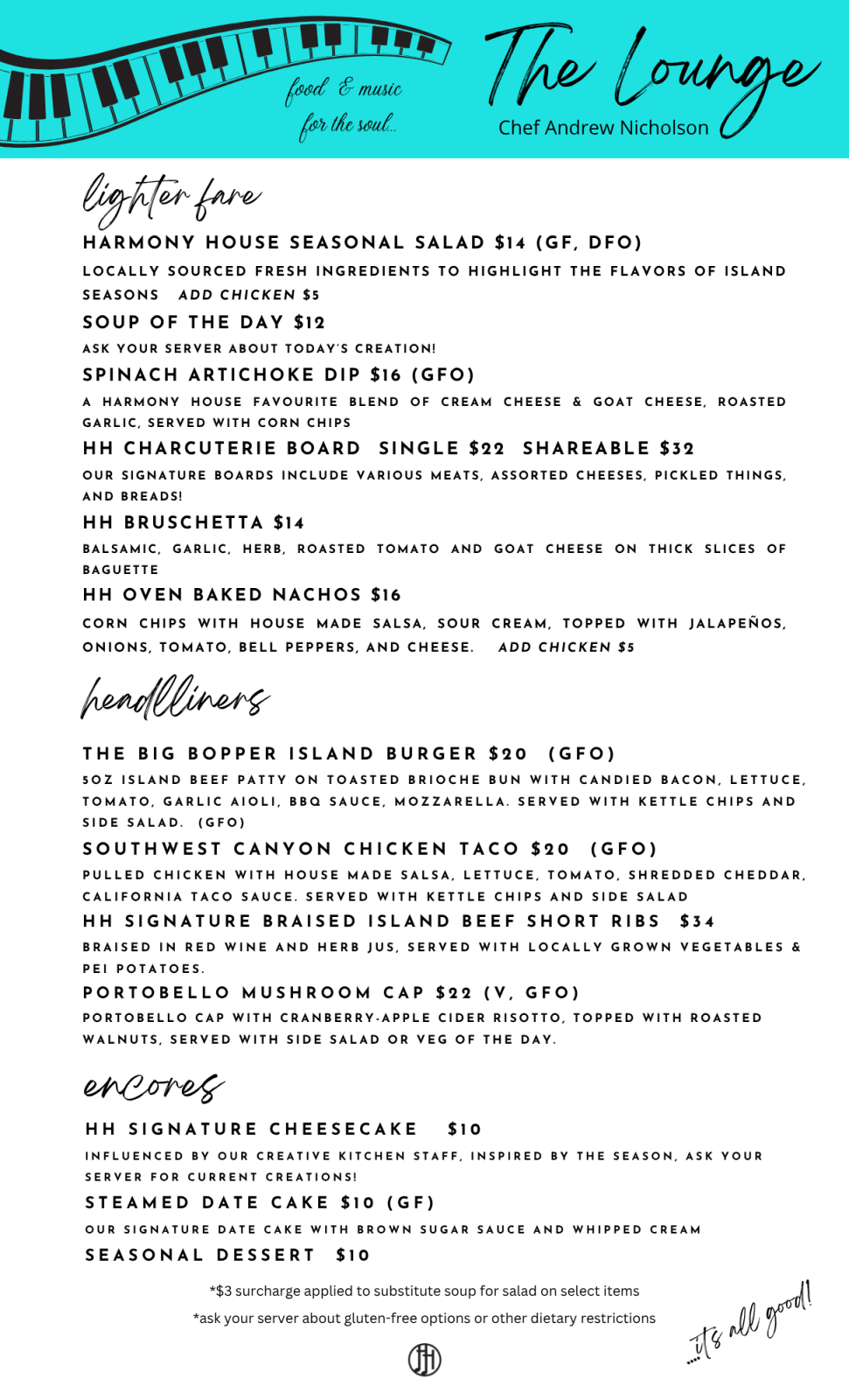 To make a dinner reservation before the show in our downstairs licensed pub, THE LOUNGE, please call 902-964-2255 or email harmonyhousePEIresos@gmail.com